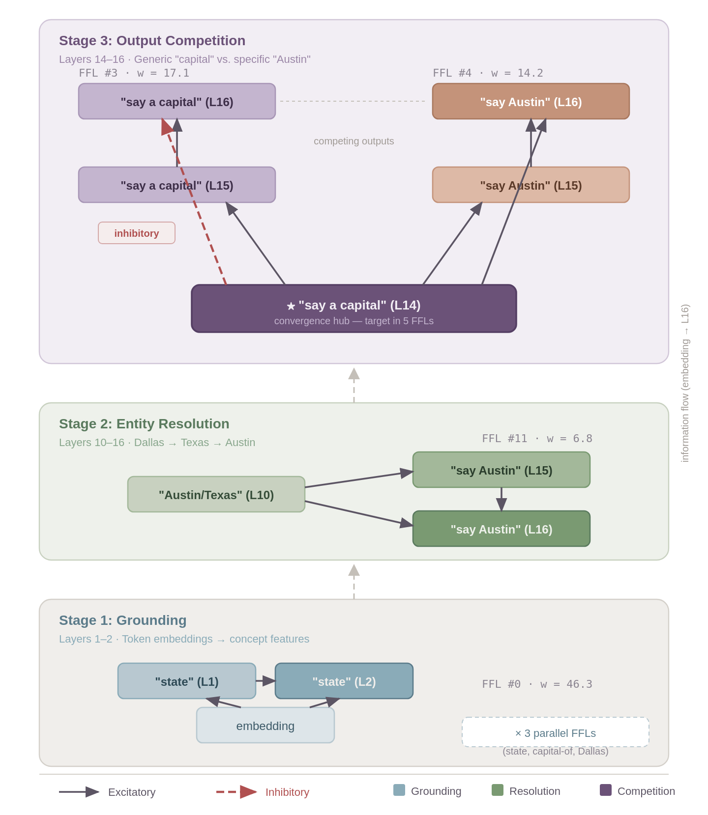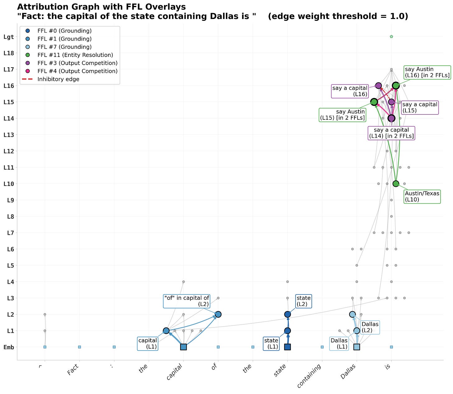 Stage 3 — Output Competition (Layers 14–16). Two FFLs converge on a shared node, “say a capital” at L14, which serves as the target in five different FFLs across the full graph, making it a convergence hub. This is where the model decides between the generic response (”a capital”) and the specific answer (”Austin”). FFL #3 (w = 17.1) propagates the generic “capital” concept forward from L14 through L15 to L16, but its direct shortcut edge from L14 to L16 is inhibitory (the only negative-weight edge among all six FFLs). This creates a self-suppression mechanism where the generic response is partially dampened at the final layer. Meanwhile, FFL #4 (w = 14.2) channels the abstract “capital” representation at L14 into the specific entity “Austin” at L15 and L16, with all edges excitatory. The competition resolves and the correct-answer pathway is fully reinforced while the generic pathway brakes itself.