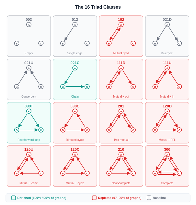 For directed networks, we can run a triad census [9] which looks for all of the 16 possible 3-node directed subgraphs. After this, each network gets a vector of Z-scores (aka motif profile) that serves as a structural fingerprint. The approach has been successfully applied to fields from neural connectivity to electronic circuits [7].