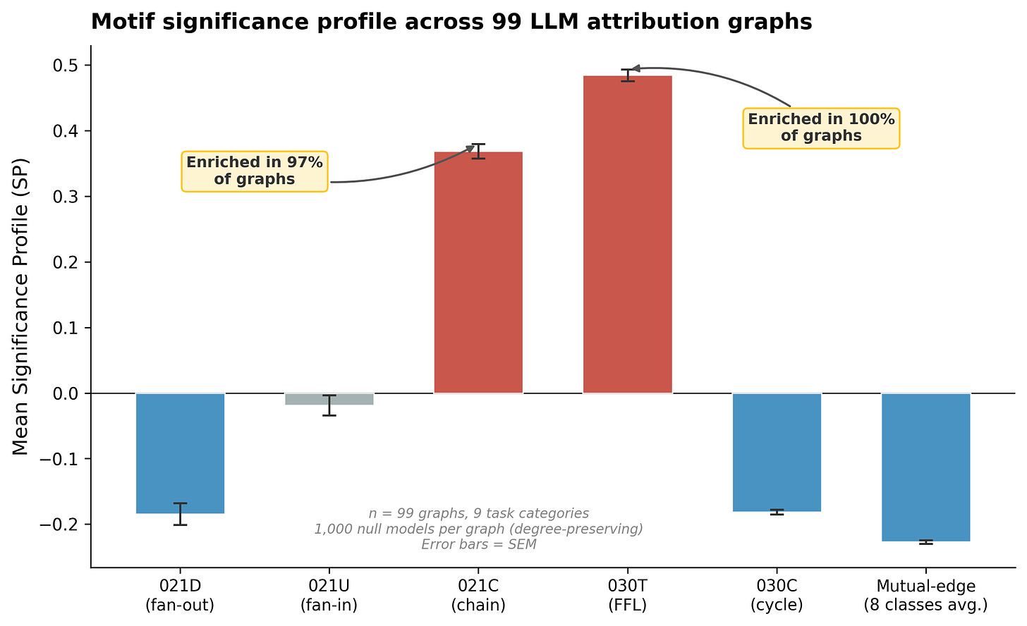 TL;DR: I have been analyzing attribution graphs manually and found it to be tedious and hard to scale. To help automate some of this process, I ported network motif analysis (the technique Uri Alon used to decode gene regulatory networks) into a tool for automatically fingerprinting the structural properties of transformer circuits. I ran it on 99 attribution graphs from Neuronpedia. The graphs are dominated by feedforward loops (FFLs), confirming that the tool recovers structure that Anthropic had previously observed qualitatively in individual circuits. The more interesting results are: (1) when I trace individual FFLs in a concrete circuit, they chain into multi-stage processing cascades with interpretable roles like grounding, entity resolution and output competition via inhibitory edges. And (2), the motif profiles show a consistent structural backbone across all task types but have with task-specific differences in the magnitude of individual motifs. The tool (circuit-motifs) is open source and runs on any attribution graph from Neuronpedia.