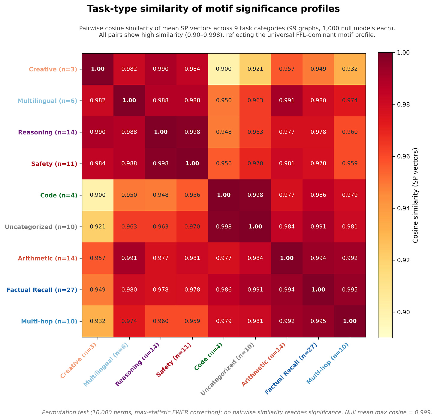 All task-type pairs show high cosine similarity (0.90–0.998), reflecting the dominance of the universal FFL/chain enrichment pattern across all graph categories. A permutation test (10,000 label shuffles, corrected for 36 pairwise comparisons) confirms that no pair is significantly more similar than expected by chance and randomly grouped graphs converge toward the global mean profile even more tightly than the real task groupings do. The high absolute similarities show the graphs have a similar wiring but not task-specific clustering.